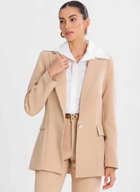 O design apresenta lapela clássica bem definida, que reforça o caráter elegante da alfaiataria, além de fechamento frontal por botão único metálico, discreto e sofisticado, que valoriza o visual clean da peça. Os recortes estratégicos e pences sutis garantem melhor ajuste ao corpo, evidenciando o cuidado na construção da peça e proporcionando um visual alinhado e refinado em todos os ângulos. Um blazer pensado nos detalhes, feito para mulheres que valorizam elegância, estrutura e versatilidade em uma única peça.