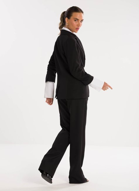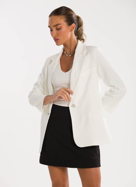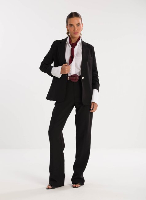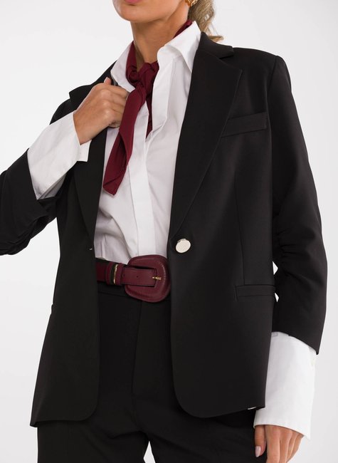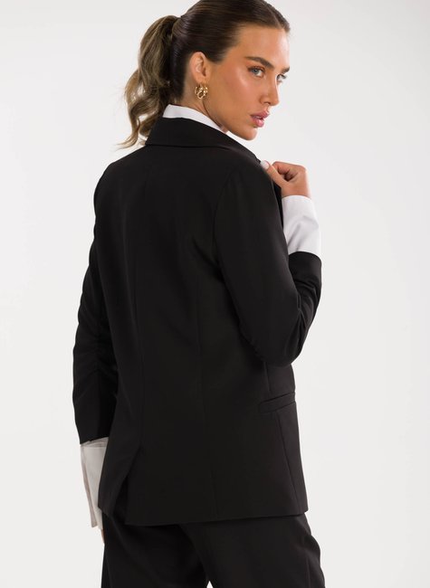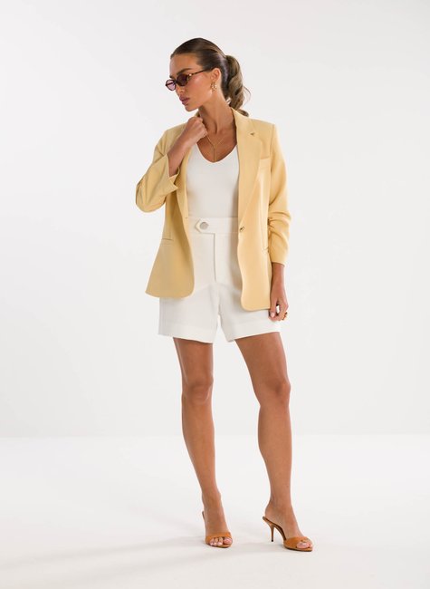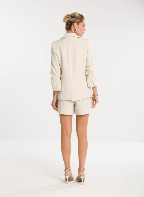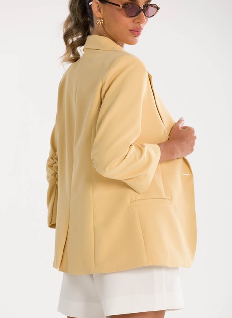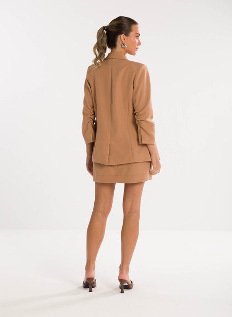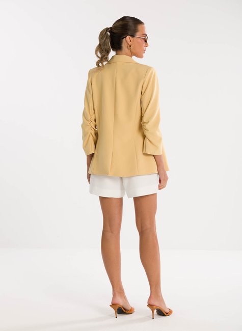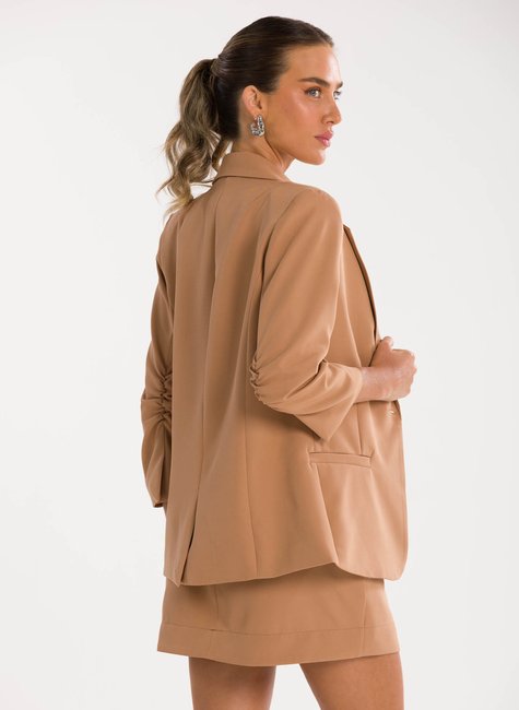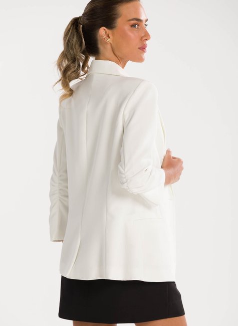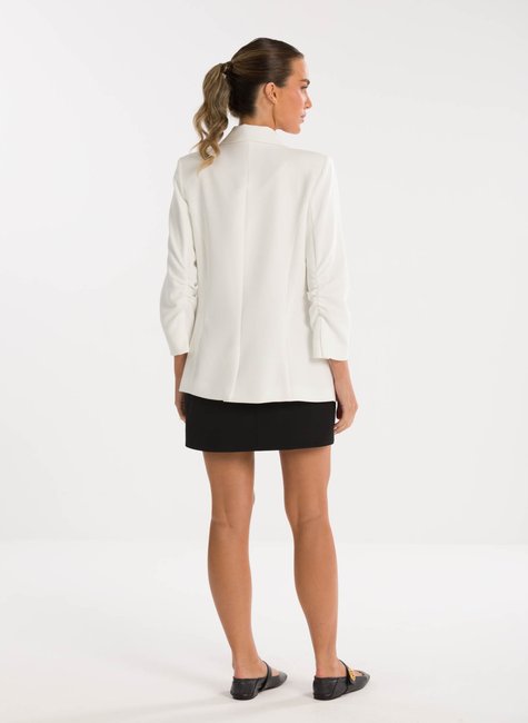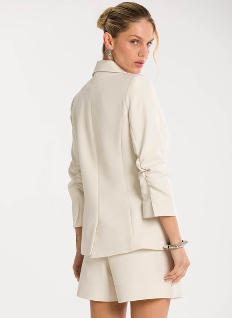 A peça ganha charme extra no detalhe das mangas ¾ levemente franzidas na altura do cotovelo, que acrescentam um ar delicado e contemporâneo à alfaiataria tradicional. Esse acabamento refinado traz movimento e sutileza ao visual, destacando-se pela originalidade sem perder a essência elegante. Confeccionado em tecido de alfaiataria de alta qualidade, o blazer proporciona conforto, caimento impecável e sofisticação em cada detalhe.