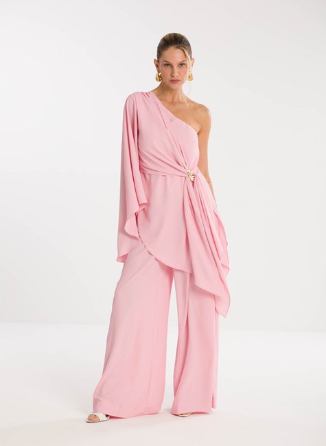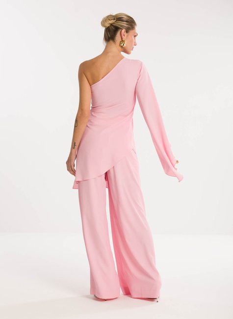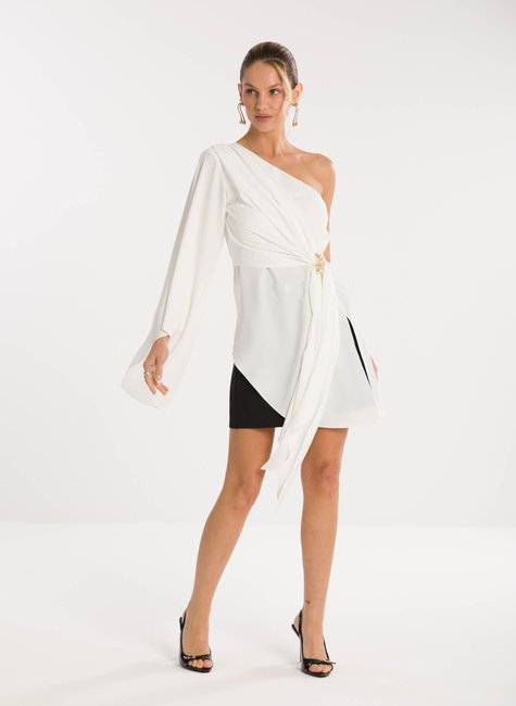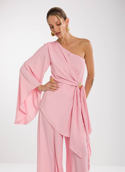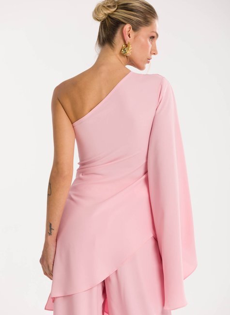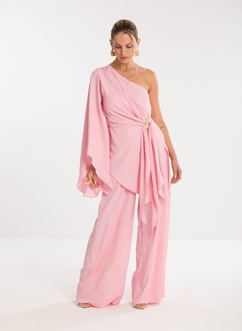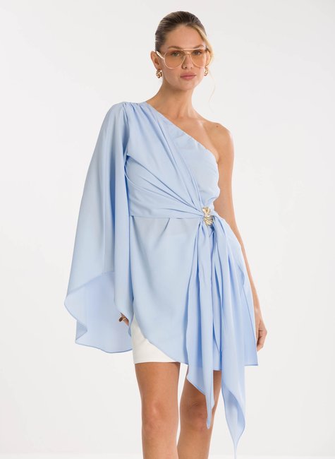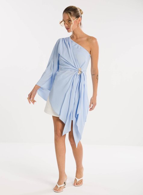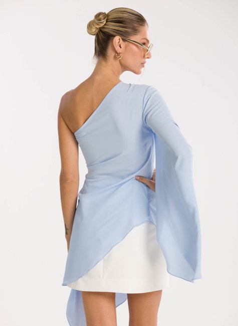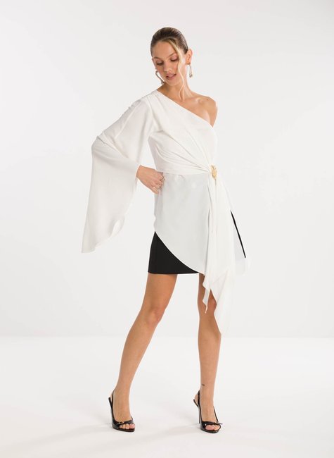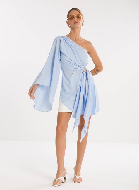 Detalhes marcantes - Com decote ombro só, a peça combina sensualidade e sofisticação na medida certa. A manga longa ampla garante movimento e fluidez, enquanto a amarração na cintura, com detalhe de fivela delicada, realça as curvas e proporciona um ajuste perfeito. A barra assimétrica alongada completa o design único, tornando a blusa versátil para composições tanto elegantes quanto fashionistas.