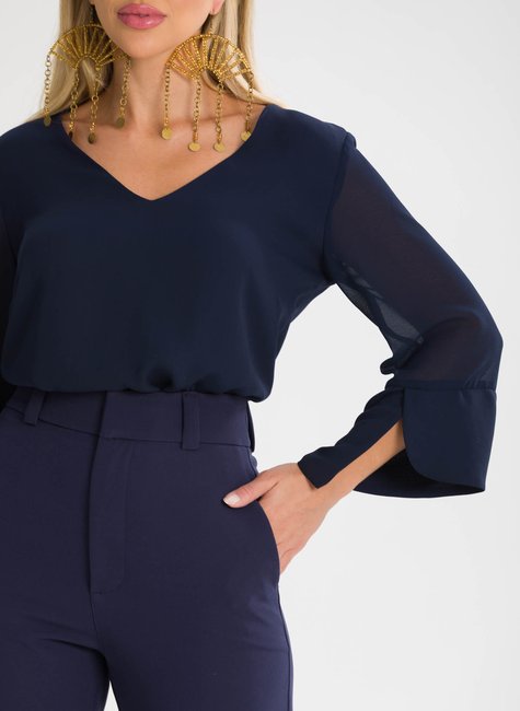 O corpo da blusa conta com frente totalmente dupla, garantindo melhor acabamento e mais segurança no uso. As mangas 3/4 são confeccionadas em crepe com leve transparência, criando um contraste sutil com o corpo da peça. O destaque fica por conta do punho diferenciado, com acabamento mais amplo e fluido, que traz movimento e um toque de sofisticação discreta. A blusa Eliz uma escolha prática, elegante e atemporal para diferentes ocasiões.