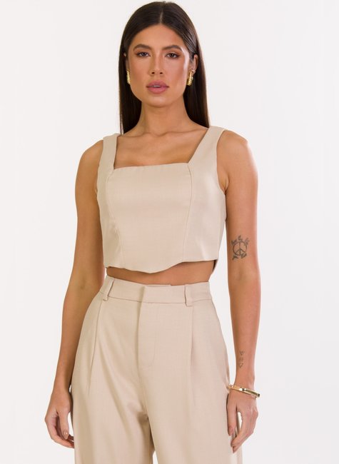 Com um design estruturado, o cropped possui um corte ajustado que valoriza a silhueta de forma refinada. O decote quadrado adiciona um toque clássico e sofisticado, equilibrando modernidade e elegância. As alças largas proporcionam conforto e sustentação, tornando a peça versátil para diferentes ocasiões. A