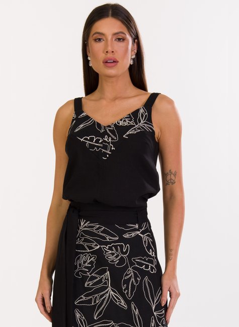 A modelagem única da regata Deise se destaca com suas alças mais largas e decote V, proporcionando um caimento perfeito e valorizando a silhueta feminina. O design desta blusa foi cuidadosamente pensado para combinar dois tipos de tecido: um bordado e um liso. Esta combinação resulta em um visual único e moderno, tornando a peça um item indispensável no guarda-roupa de qualquer mulher.