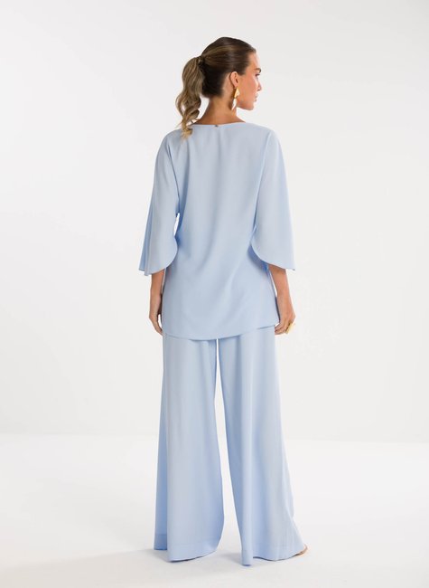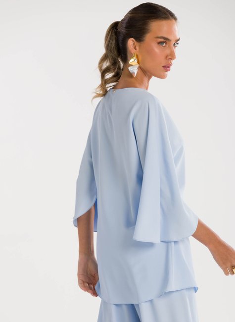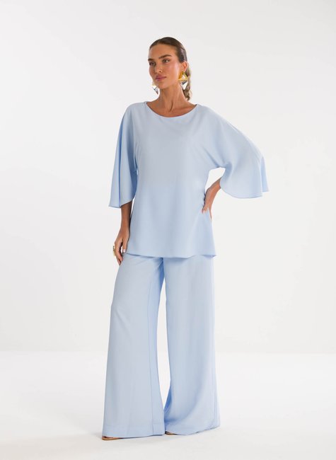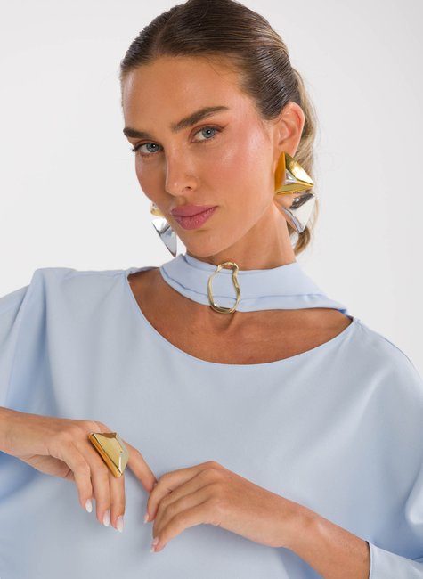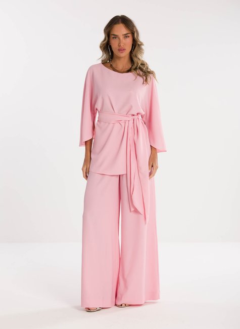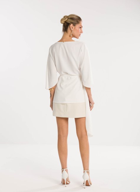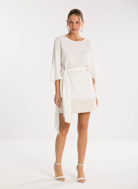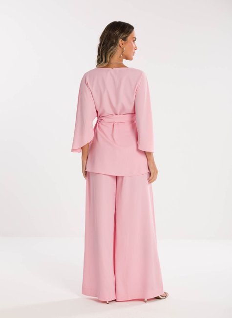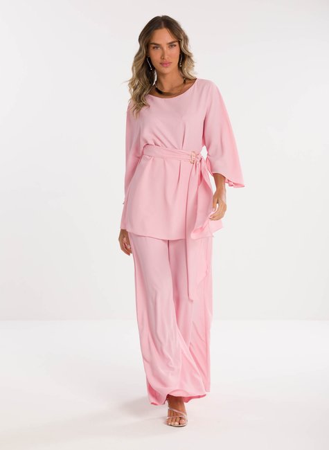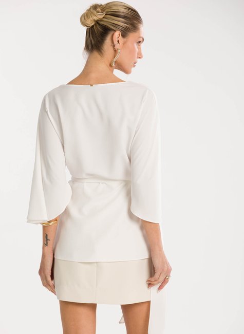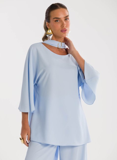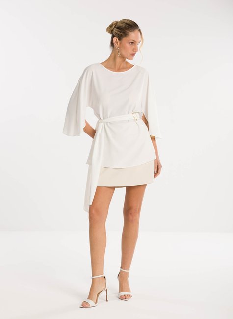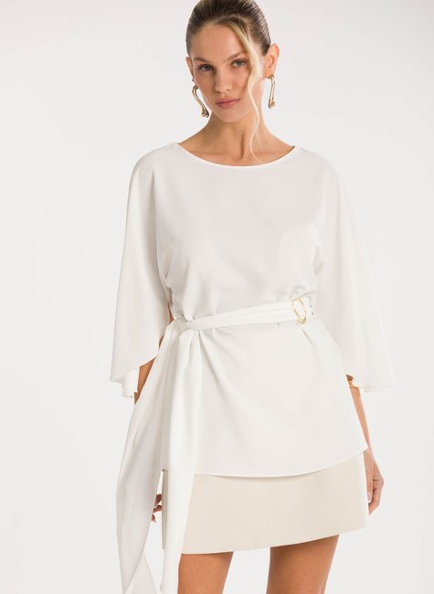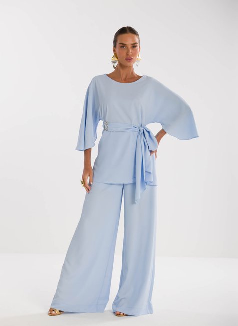 Detalhes marcantes - Com modelagem ampla e caimento fluido, a blusa traz mangas estilo morcego que proporcionam movimento e conforto. A gola arredondada mantém a proposta clean e atemporal, enquanto o cinto de amarração na cintura, com detalhe em fivela delicada, realça a feminilidade e garante um ajuste perfeito ao corpo. A barra levemente alongada completa o visual com toque de sofisticação, tornando a peça ideal tanto para produções casuais quanto para ocasiões mais especiais.