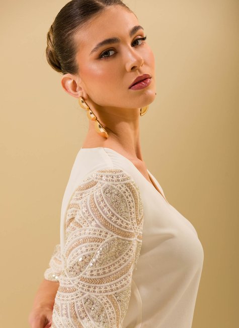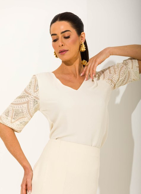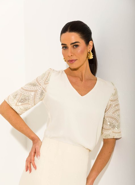 As mangas em paetê bordado adicionam brilho delicado e refinado, transformando a peça em um destaque especial sem perder a sutileza. O contraste entre o corpo liso e o trabalho rico das mangas cria um equilíbrio perfeito entre discrição e impacto. Uma peça versátil que transita com naturalidade entre o ambiente de trabalho, eventos sociais ou produções casuais com um toque elegante.