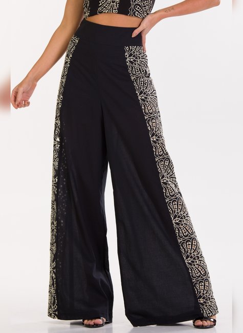 Com uma modelagem única, essa calça possui cintura alta, o que valoriza a silhueta feminina e confere um toque de sofisticação. Além disso, sua abertura maior do que o tradicional na pantalona traz um charme extra à peça, garantindo um visual mais despojado e moderno. O grande destaque dessa calça está em seu acabamento cuidadosamente elaborado. A lateral é detalhada com um tecido bordado, que adiciona um toque de glamour e faz com que essa peça se destaque em qualquer ambiente, seja em ocasiões formais ou descontraídas.
