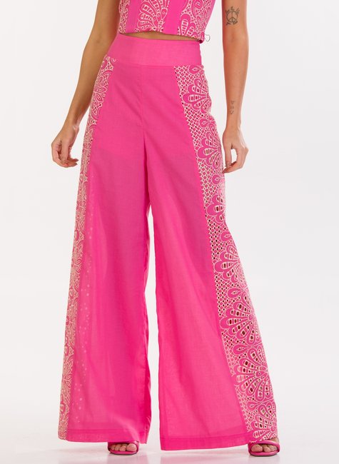 Com uma modelagem única, essa calça possui cintura alta, o que valoriza a silhueta feminina e confere um toque de sofisticação. Além disso, sua abertura maior do que o tradicional na pantalona traz um charme extra à peça, garantindo um visual mais despojado e moderno. O grande destaque dessa calça está em seu acabamento cuidadosamente elaborado. A lateral é detalhada com um tecido bordado, que adiciona um toque de glamour e faz com que essa peça se destaque em qualquer ambiente, seja em ocasiões formais ou descontraídas.