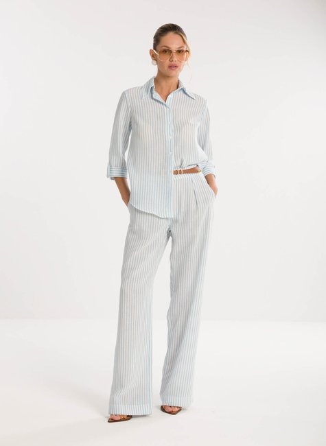 Detalhes Bem Pensados - Confeccionada em tecido listrado de alta qualidade, é leve, sofisticada e ideal para composições frescas e modernas, tornando-se uma peça versátil que transita facilmente entre o trabalho e momentos casuais com charme.