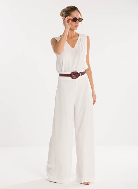 Detalhes bem pensados - Cós estruturado com passantes, fechamento frontal delicado e vinco marcado ao longo das pernas, criando efeito alongador. A barra reta e o tecido de toque refinado completam o design, proporcionando movimento e imponência ao vestir.