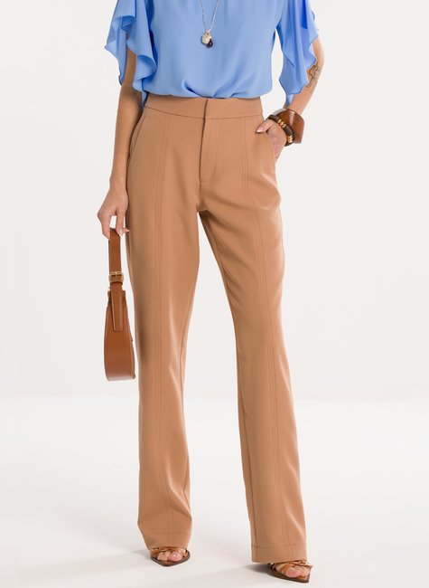 Sobre a Peça - A Calça Reta Rebeca apresenta modelagem de cintura alta com caimento reto, que valoriza a silhueta de forma elegante e alongada. Detalhes Bem Pensados - Possui recortes verticais que percorrem toda a extensão da peça, criando um efeito de alongamento visual. O cós é liso e estruturado, com fechamento frontal embutido, garantindo um acabamento limpo e sofisticado. Confeccionada em tecido encorpado e maleável, oferece conforto e versatilidade para composições formais ou casuais.