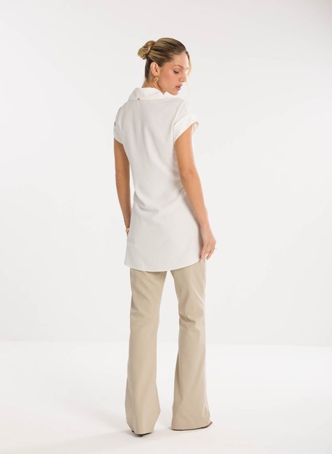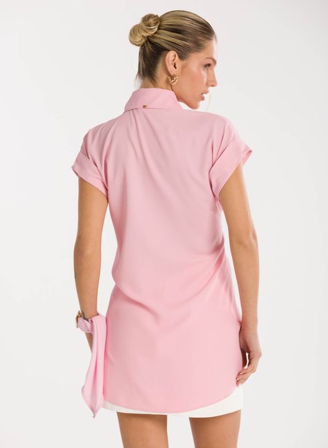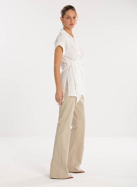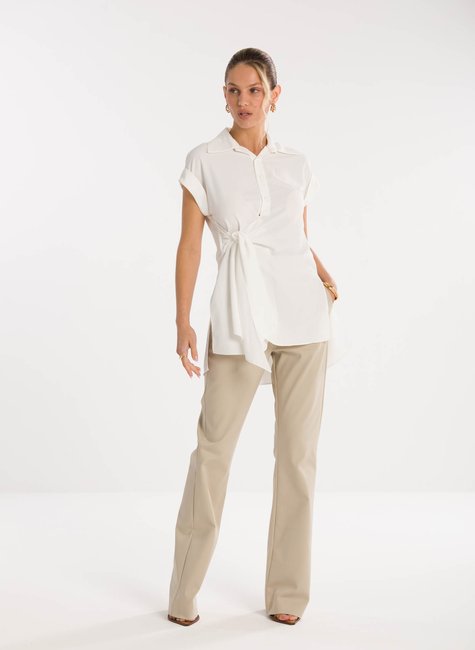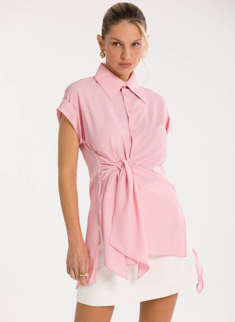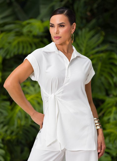 Detalhes bem pensados - Com gola clássica e fechamento por botões frontais, a peça apresenta mangas curtas com acabamento dobrado, proporcionando leveza e descontração ao visual. O grande destaque fica por conta da amarração frontal em tecido alongado, que cria um efeito de laço fluido e confere movimento ao look. O caimento solto garante conforto, enquanto o detalhe assimétrico da barra adiciona personalidade e charme.