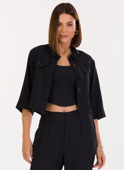 O grande diferencial desta peça está nos detalhes minuciosamente pensados. Os pespontos aparentes adicionam um toque de sofisticação ao design, enquanto os bolsos frontais não só aprimoram a estética, mas também proporcionam praticidade. A modelagem cropped desta camisa permite uma infinidade de opções de combinação, permitindo que você ouse em sua escolha de partes inferiores, seja com saias de cintura alta, calças de alfaiataria ou shorts modernos. Ela é versátil o suficiente para se adaptar a várias situações, seja em um dia de trabalho, uma saída casual com amigos ou um evento mais formal.