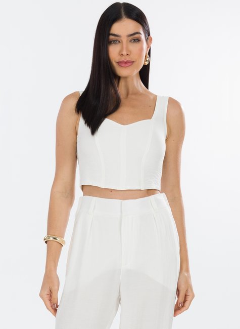 Com comprimento cropped, ela valoriza a silhueta feminina ao deixar a cintura à mostra de forma sutil e estilosa. Seu design apresenta alças largas que proporcionam conforto e sustentação, além de conferir um toque contemporâneo ao visual. A blusa possui um caimento estruturado, típico da alfaiataria, garantindo uma modelagem impecável e alinhada ao corpo. O decote em formato discreto realça o colo de maneira refinada, enquanto o tecido leve e fluido proporciona liberdade de movimento e um toque agradável à pele.