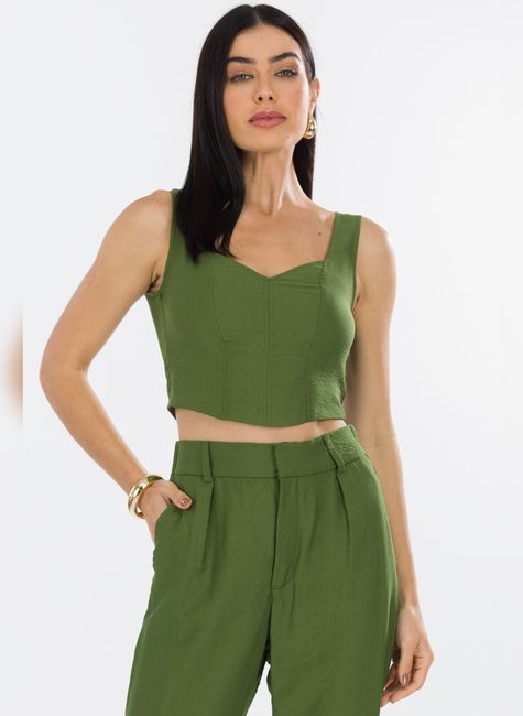 Com comprimento cropped, ela valoriza a silhueta feminina ao deixar a cintura à mostra de forma sutil e estilosa. Seu design apresenta alças largas que proporcionam conforto e sustentação, além de conferir um toque contemporâneo ao visual. A blusa possui um caimento estruturado, típico da alfaiataria, garantindo uma modelagem impecável e alinhada ao corpo. O decote em formato discreto realça o colo de maneira refinada, enquanto o tecido leve e fluido proporciona liberdade de movimento e um toque agradável à pele.