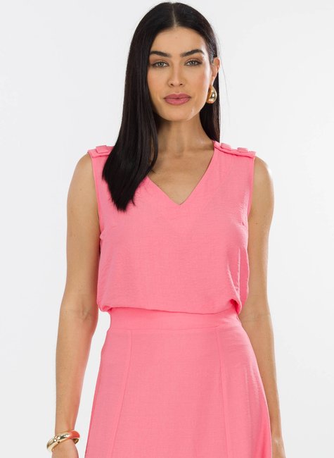 A blusa regata apresentada possui um design sofisticado e moderno, ideal para composições elegantes e casuais. Suas alças largas são destacadas por detalhes discretos de botões, adicionando um toque de charme ao visual. O decote em "V" valoriza o colo de forma delicada, proporcionando um equilíbrio entre simplicidade e elegância.