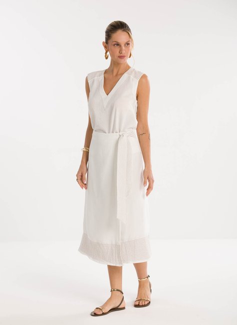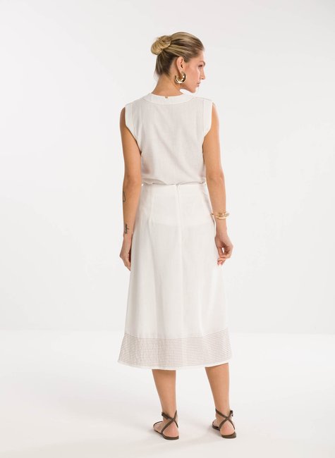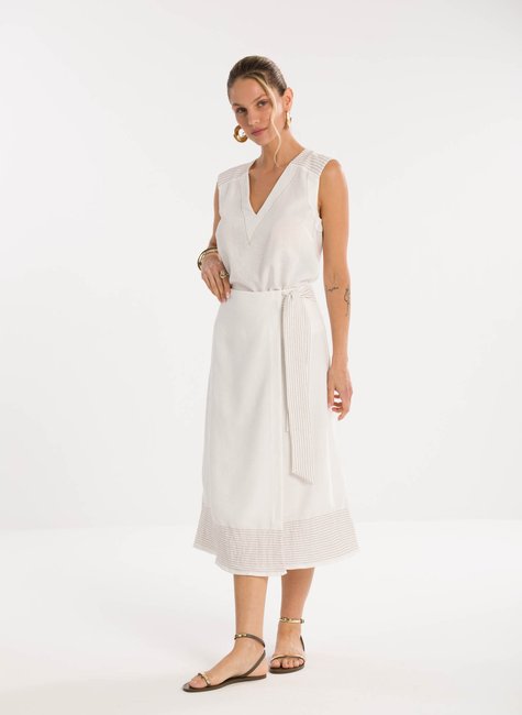 Detalhes bem pensados - O charme especial da peça está nos acabamentos cuidadosamente trabalhados: a amarração com faixa fina traz movimento e delicadeza, enquanto a barra possui detalhe em pespontos horizontais que enriquecem o visual e adicionam sofisticação. Cada traço do design foi pensado para proporcionar um estilo autêntico e moderno, tornando a saia um item indispensável no guarda-roupa de quem valoriza beleza, conforto e versatilidade.