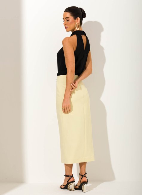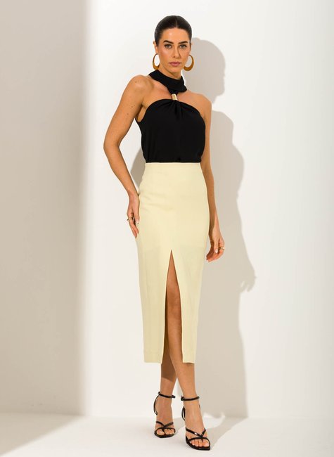O destaque fica por conta da fenda frontal, que além de proporcionar movimento e leveza, adiciona sensualidade na medida certa. Versátil e cheia de estilo, a saia midi Letizia transita com naturalidade entre ocasiões formais e produções modernas para o dia a dia, sempre com um ar elegante e distinto.