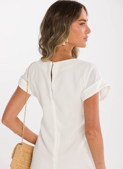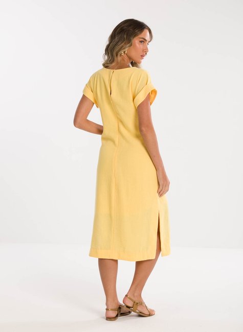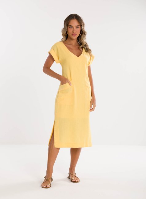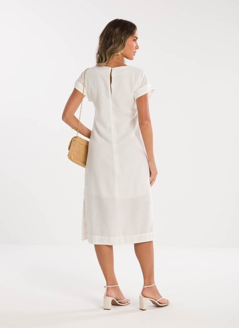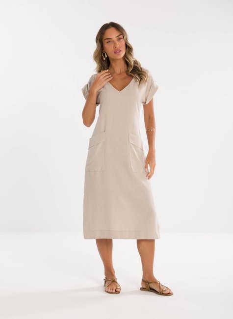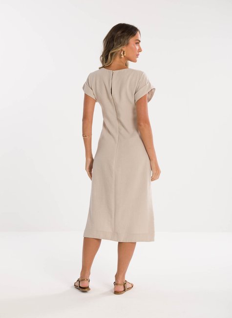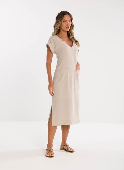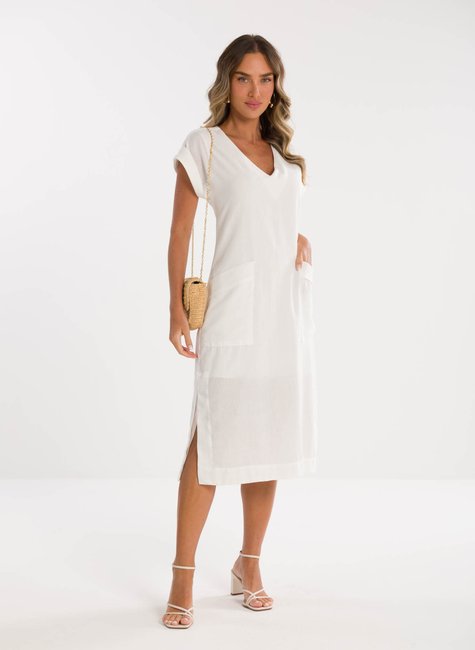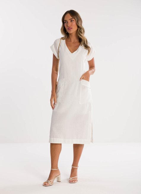 Com decote em “V” que valoriza o colo, mangas dobradas que adicionam um toque moderno e bolsos frontais funcionais, o vestido combina praticidade e estilo. A fenda lateral traz movimento e leveza, tornando a peça ainda mais feminina e sofisticada.