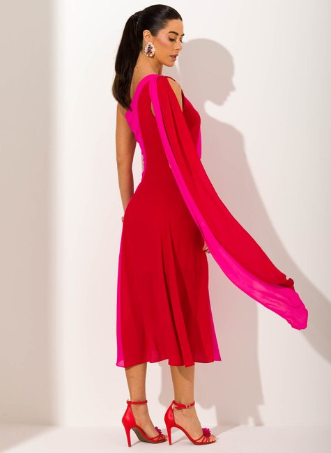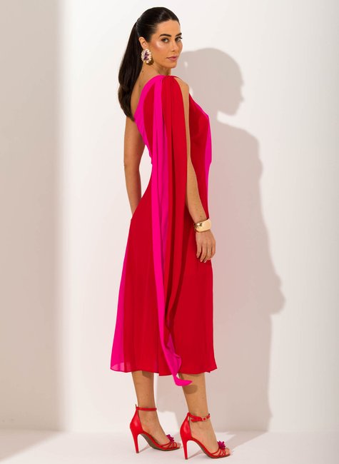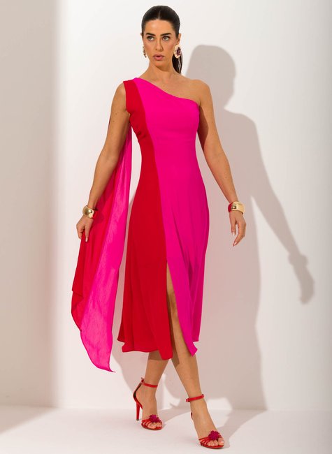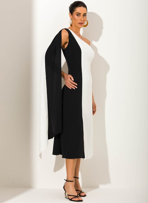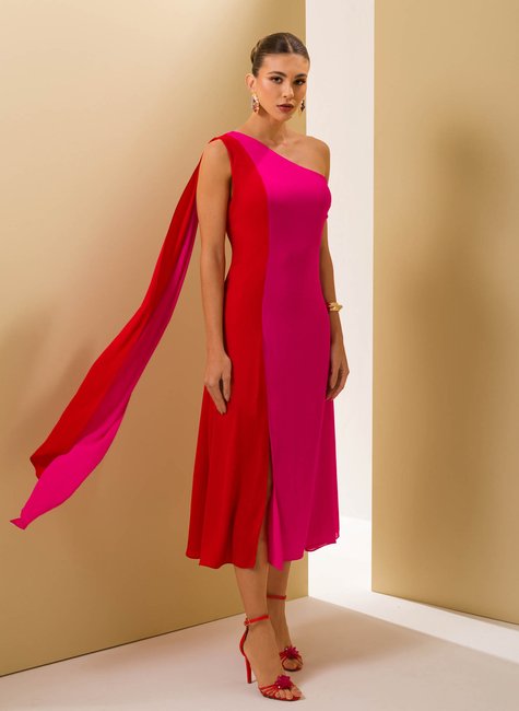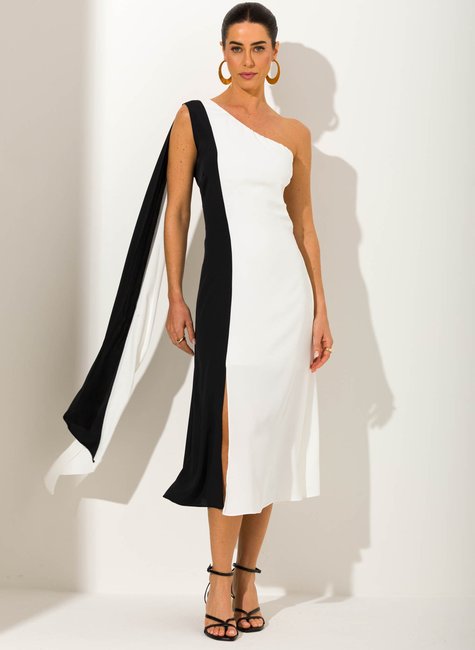 O vestido bicolor Akira é puro impacto visual. Sua modelagem assimétrica, com alça única e recorte elegante, cria uma silhueta sofisticada e marcante. O comprimento midi com fenda frontal acrescenta ousadia na medida certa, equilibrando sensualidade e refinamento.