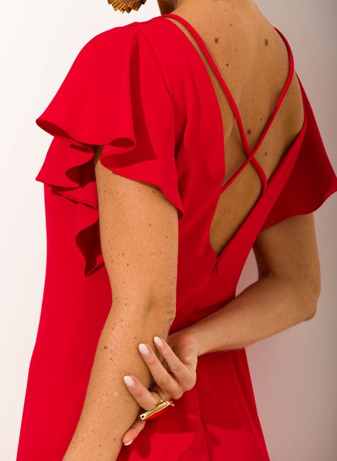 O grande destaque está nas costas: o decote profundo em tiras cruzadas cria um efeito marcante e contemporâneo, revelando a pele de forma elegante. O corte estratégico valoriza o corpo sem excessos, enquanto o caimento fluido traz imponência e sofisticação a cada passo. Uma peça rica em detalhes, perfeita para ocasiões especiais, onde a presença precisa ser memorável e chique.
