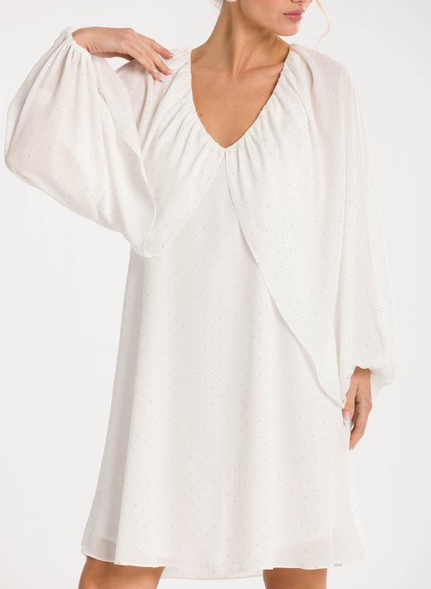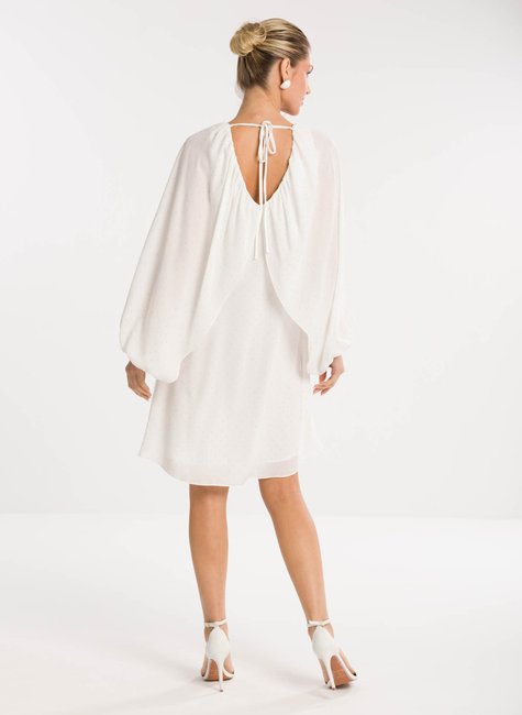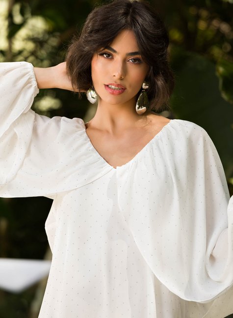 SOBRE A PEÇA - O Vestido Curto Aysha é sinônimo de feminilidade e sofisticação. Sua modelagem delicada transmite leveza e elegância, perfeita para ocasiões especiais ou momentos em que você deseja se sentir única e refinada. DETALHES BEM PENSADOS - Com decote em V que valoriza o colo de forma sutil, a peça se destaca pela capa fluida sobreposta, criando movimento e um efeito visual encantador. As mangas longas bufantes trazem um ar romântico e sofisticado, equilibrando modernidade com delicadeza. O comprimento curto garante frescor e leveza, enquanto os acabamentos bem trabalhados ressaltam o cuidado nos mínimos detalhes.