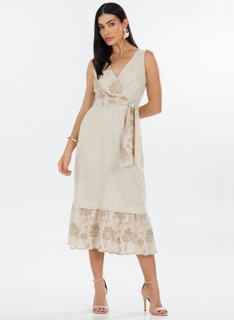 O vestido Izabel destaca-se por seus detalhes únicos e sofisticados. O decote em V valoriza o colo de maneira elegante, enquanto o laço no mesmo tecido do vestido permite um ajuste ideal ao corpo, realçando a silhueta de forma delicada e charmosa. A mescla de tecido bordado adiciona um toque extra de charme e sofisticação, tornando esta peça ainda mais especial.