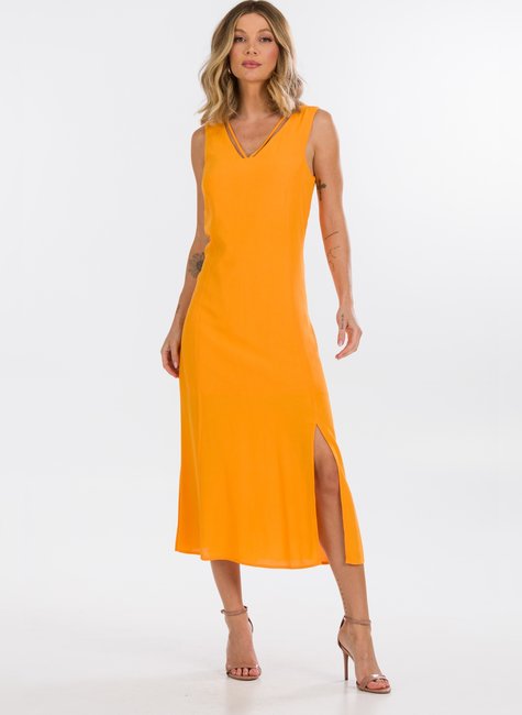 O comprimento midi e a fenda discreta na lateral garantem fluidez e liberdade de movimento, mantendo o equilíbrio entre elegância e praticidade. O caimento reto oferece uma aparência alongada e suave, destacando a simplicidade sofisticada da peça. Ideal para eventos diurnos ou noturnos, esse vestido é versátil, permitindo combinações tanto com acessórios mais casuais quanto mais sofisticados, dependendo da ocasião.