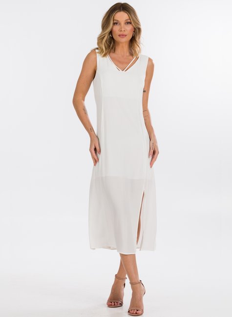 O comprimento midi e a fenda discreta na lateral garantem fluidez e liberdade de movimento, mantendo o equilíbrio entre elegância e praticidade. O caimento reto oferece uma aparência alongada e suave, destacando a simplicidade sofisticada da peça. Ideal para eventos diurnos ou noturnos, esse vestido é versátil, permitindo combinações tanto com acessórios mais casuais quanto mais sofisticados, dependendo da ocasião.