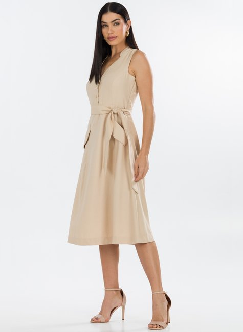 O vestido possui um decote em "V" que alonga o pescoço e valoriza a região do colo, enquanto a ausência de mangas proporciona leveza e um toque contemporâneo. A parte frontal é adornada com uma fileira de botões cobertos do mesmo tecido, que vão do busto até a altura da cintura, adicionando um detalhe funcional e estético que realça a verticalidade do design. A cintura é marcada por uma faixa ajustável do mesmo tecido, que pode ser amarrada em um