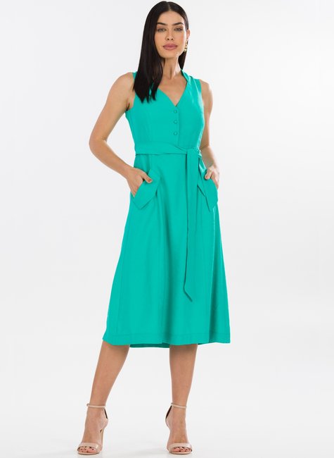 O vestido possui um decote em "V" que alonga o pescoço e valoriza a região do colo, enquanto a ausência de mangas proporciona leveza e um toque contemporâneo. A parte frontal é adornada com uma fileira de botões cobertos do mesmo tecido, que vão do busto até a altura da cintura, adicionando um detalhe funcional e estético que realça a verticalidade do design. A cintura é marcada por uma faixa ajustável do mesmo tecido, que pode ser amarrada em um