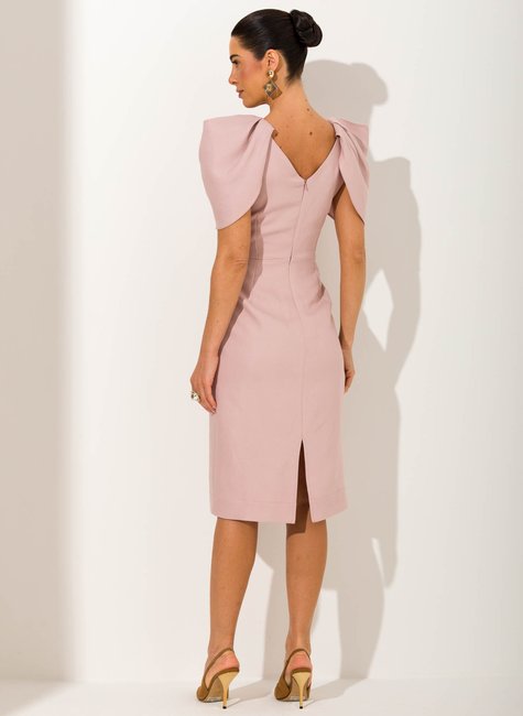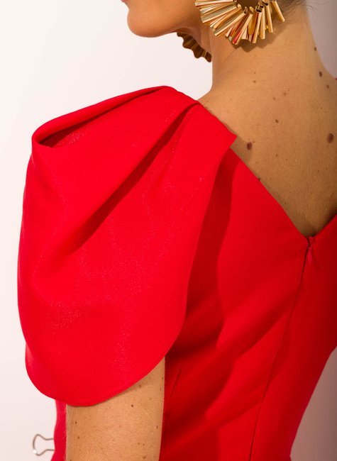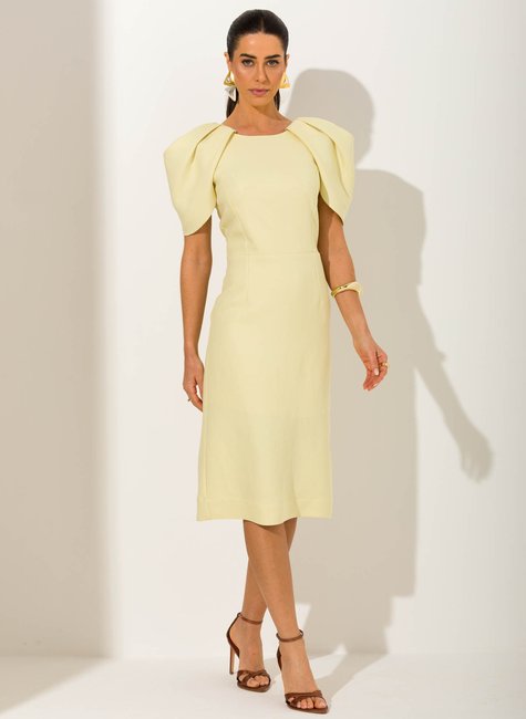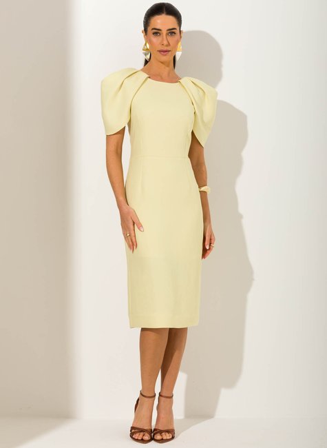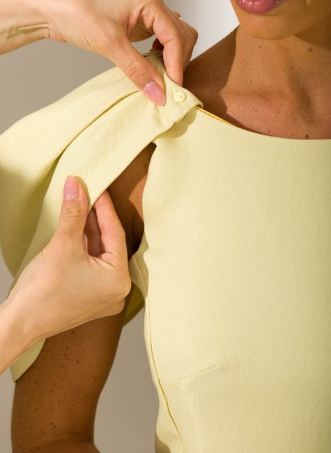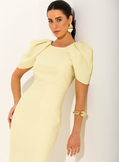 O grande diferencial está nas mangas bufantes estruturadas, que criam um efeito impactante e imponente, transformando o visual em um verdadeiro statement de estilo. Além disso, as mangas são removíveis, permitindo usar a peça de duas maneiras distintas: com um toque de ousadia e presença marcante ou de forma mais clássica e minimalista. Essa possibilidade de adaptação torna o vestido ainda mais exclusivo, sofisticado e desejável.