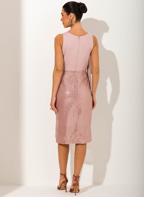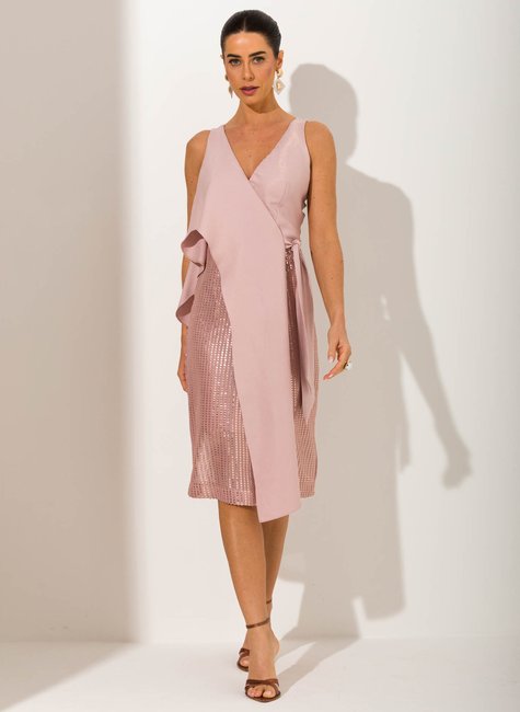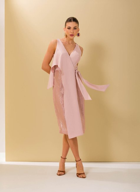 O diferencial está no contraste de texturas: a fluidez do tecido principal se encontra com o brilho marcante do bordado em paetês, revelado de forma sutil através da fenda frontal. Amarração lateral, recortes estratégicos e caimento impecável completam a peça, que traduz charme e refinamento com um toque contemporâneo.