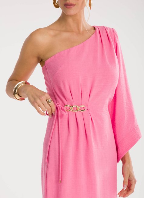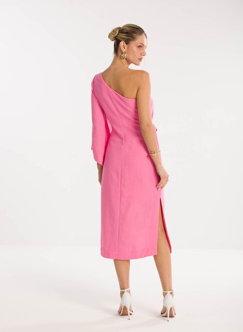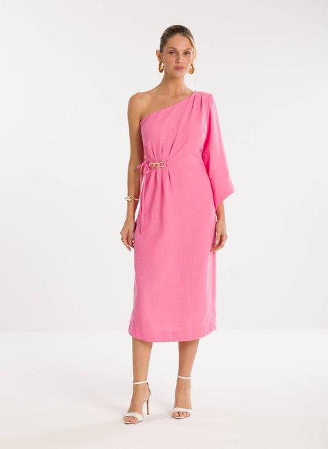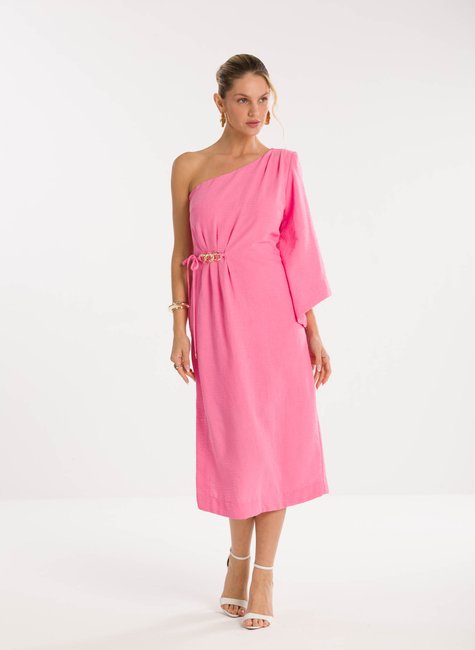 Detalhes bem pensados - O modelo apresenta uma manga ampla que equilibra o visual com fluidez, além do detalhe de amarração na cintura com aplicação em corrente que traz um toque de sofisticação refinada. O comprimento midi garante versatilidade, permitindo que a peça transite do dia para a noite com elegância e destaque em qualquer ocasião.