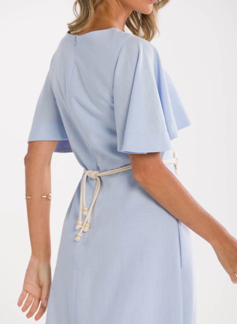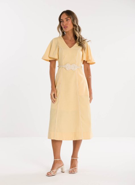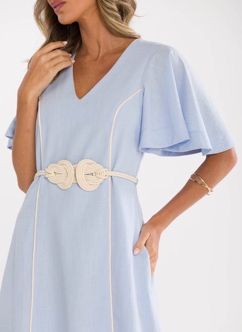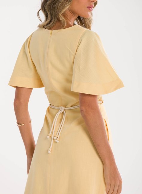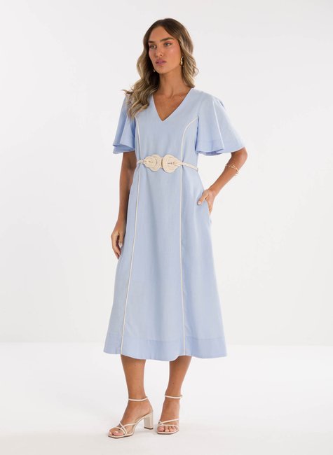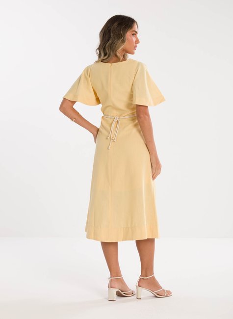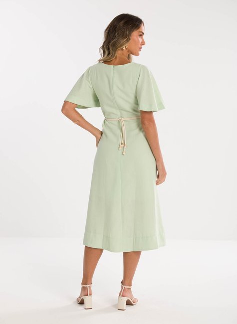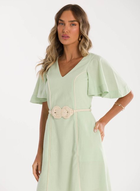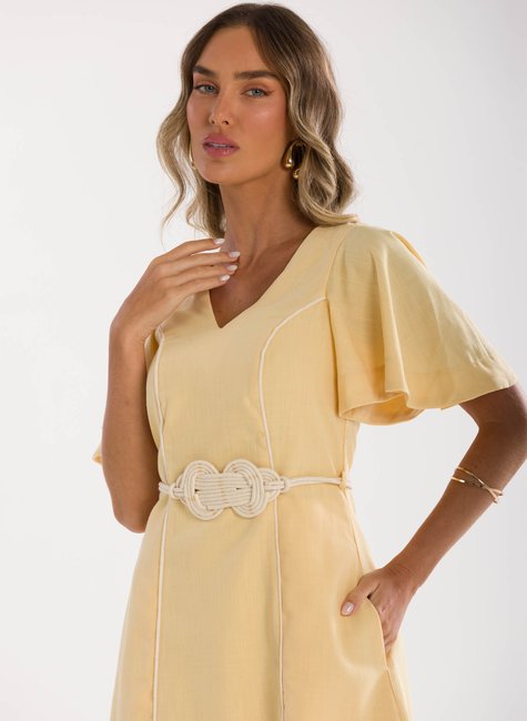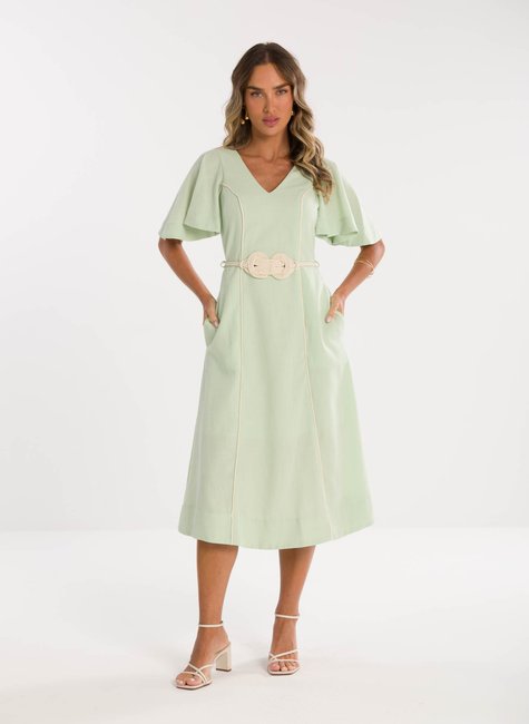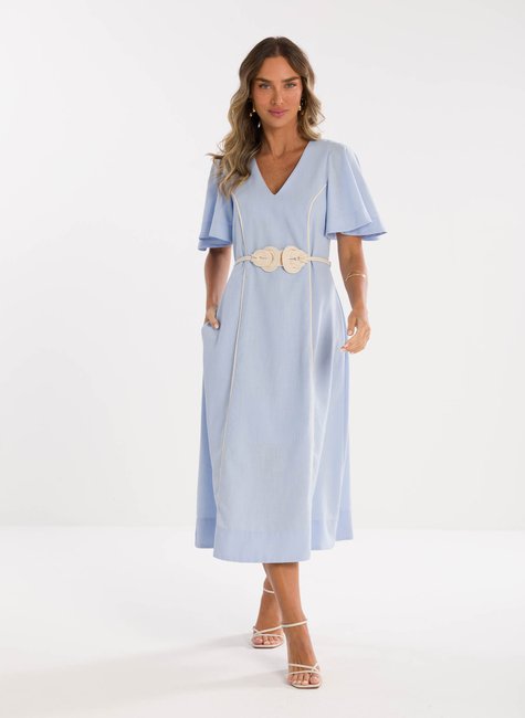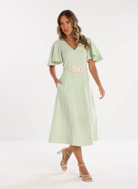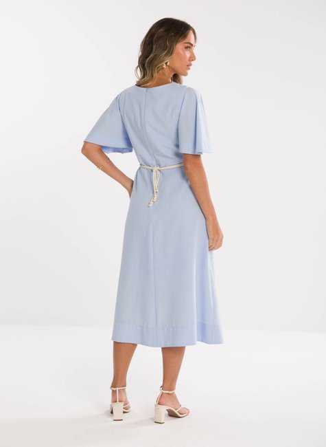 Detalhes Bem Pensados - O tecido leve e com excelente caimento transmite suavidade e frescor à primeira vista. Visualmente refinado e confortável ao toque, revela qualidade perceptível até mesmo sem vestir. Os detalhes fazem toda a diferença: mangas amplas estilo "borboleta" que adicionam balanço, decote em V que valoriza o colo, e um cinto trançado que define a cintura com charme sutil e personalidade.